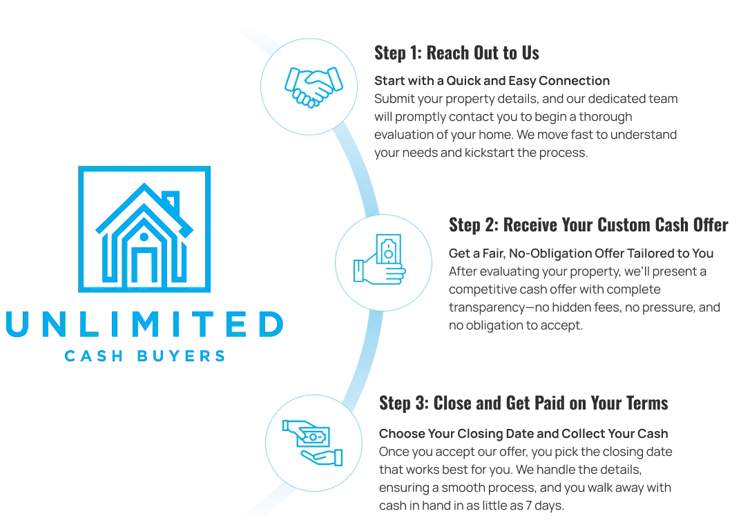 Many assume cash home buyers are only for urgent sales, but Unlimited Cash Buyers serves homeowners seeking a hassle-free alternative to traditional methods. Whether you’re avoiding costly repairs, tired of endless showings, or frustrated with realtor complexities, we buy your home as-is, saving you time and effort. Close in as little as 7-30 days or on your preferred schedule.
